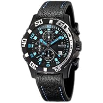 Shop online Festina Men's Crono Con Alarma F16289/6 Black Leather Quartz Watch with Black Dial Sport watch, Quartz movement, Chronograph featuring 12-hour, 25-minute and chronograph seconds subdials, Alarm mode, Polished gunmetal hands and sweep seconds with blue luminescent accents and silver/blue alarm hand, Blue hands mark subdials, Blue Arabic numbers and indices, White Arabic numbers and indices mark subdials, Applied silver-tone square hour markers with blue luminous accents, Analog date aperture